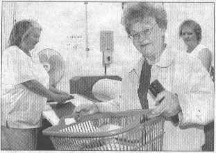 ![]() Liselotte Beyer (74) hat gerade ihre fertige Wäsche abgeholt. Im Hintergrund haben sich Erika Sagert (links) und Sabine Fredow mittlerweile schon die nächsten Stücke vorgenommen. MOZ-Fotos: Bettina Winkler |